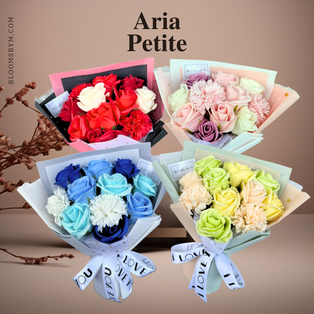 A small lightly scented soap flowers bouquet with a combination of roses and carnations. An understated and everlasting beauty.