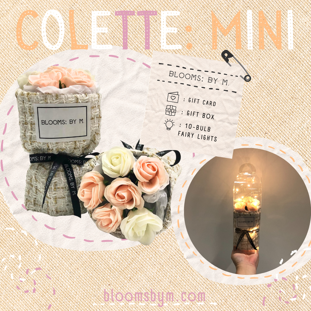 Colette: Mini A specially crafted mini version of our best-selling Colette, featuring the same timeless elegance with tweed fabric wrapping with 6 mini ever-lasting soap flowers (roses). Main Blooms: 6 mini roses (soap flowers) Approximate bouquet measurements: 8cm x 15cm. Your options: