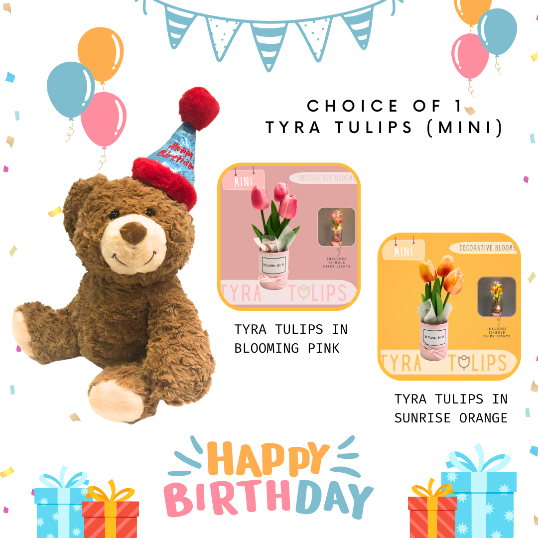 Soft Toy Plushie - Birthday Teddy+Faux Tulips Flower Box-Tyra Tulips Mini Bundle