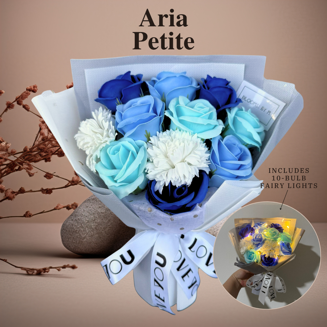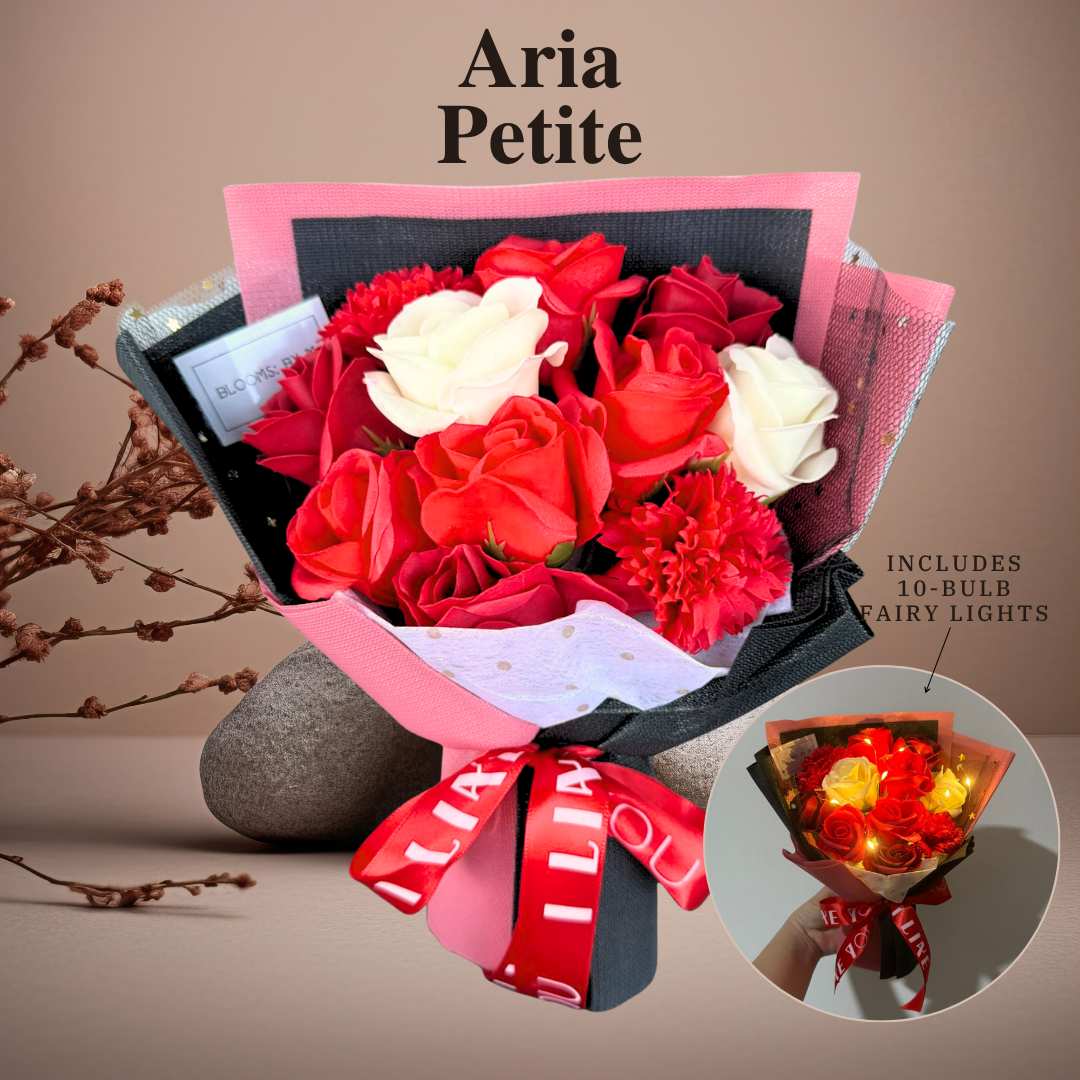 Aria Petite A small lightly scented soap flowers bouquet with a combination of roses and carnations. An understated and everlasting beauty. This bouquet is crafted with soap flowers. Main Blooms: Roses and Carnations (Soap Flowers). Approximate measurements: 16cm x 22cm Your options: