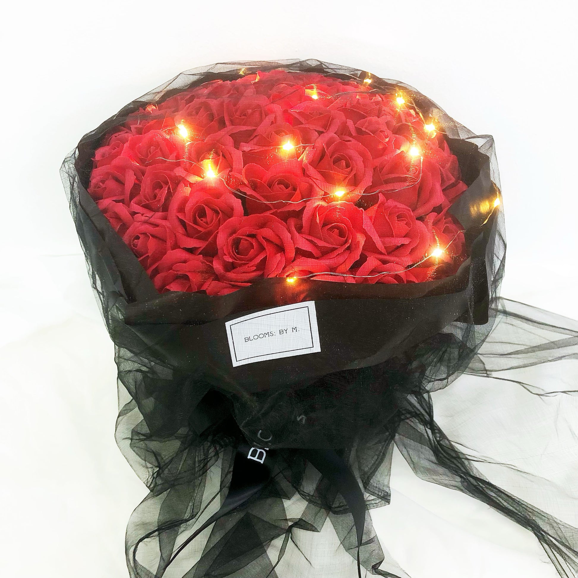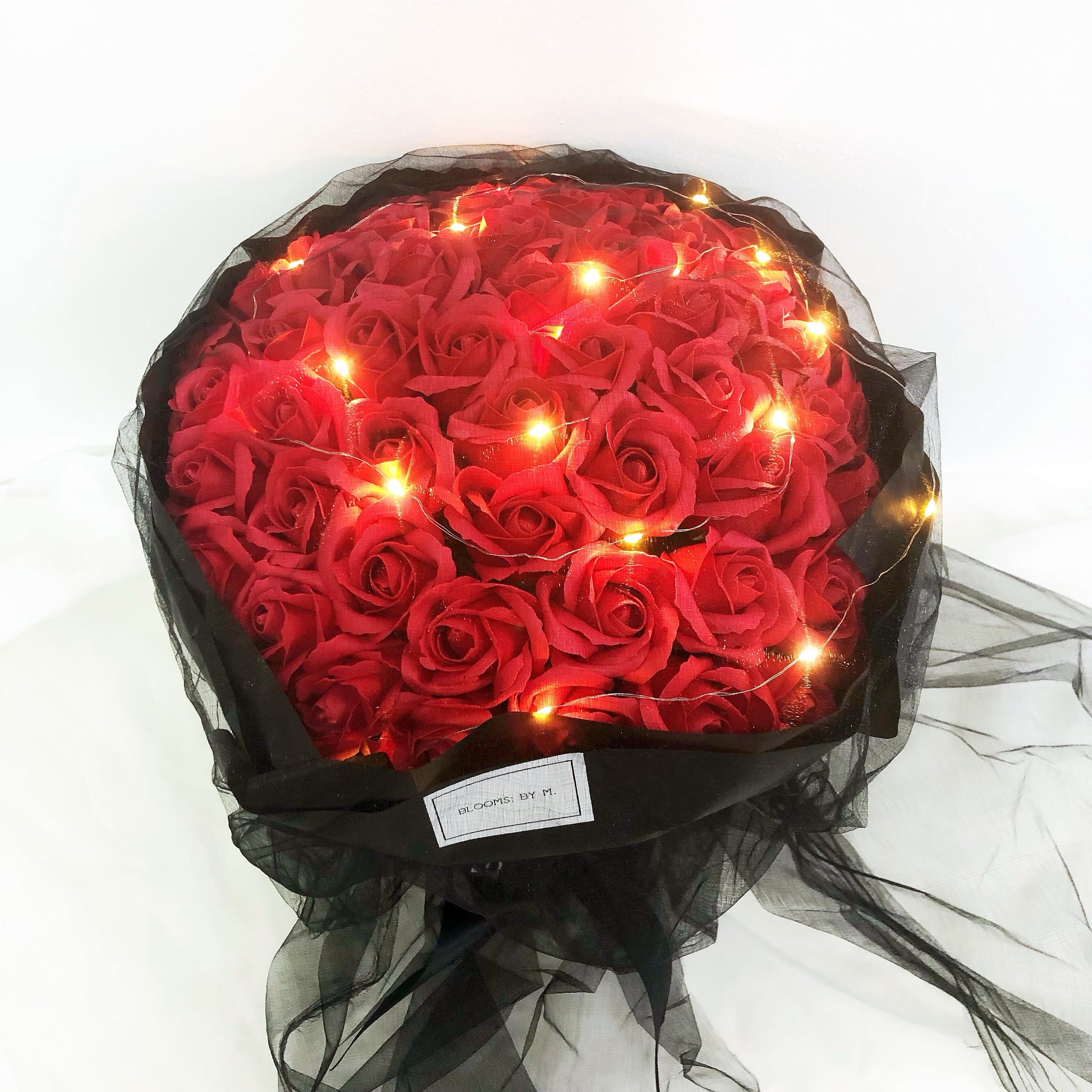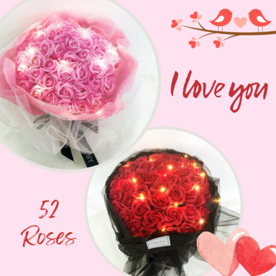 Simple and straight-forward. 52 ever-lasting roses (soap flowers) with a veil and 20-bulb fairy lights.