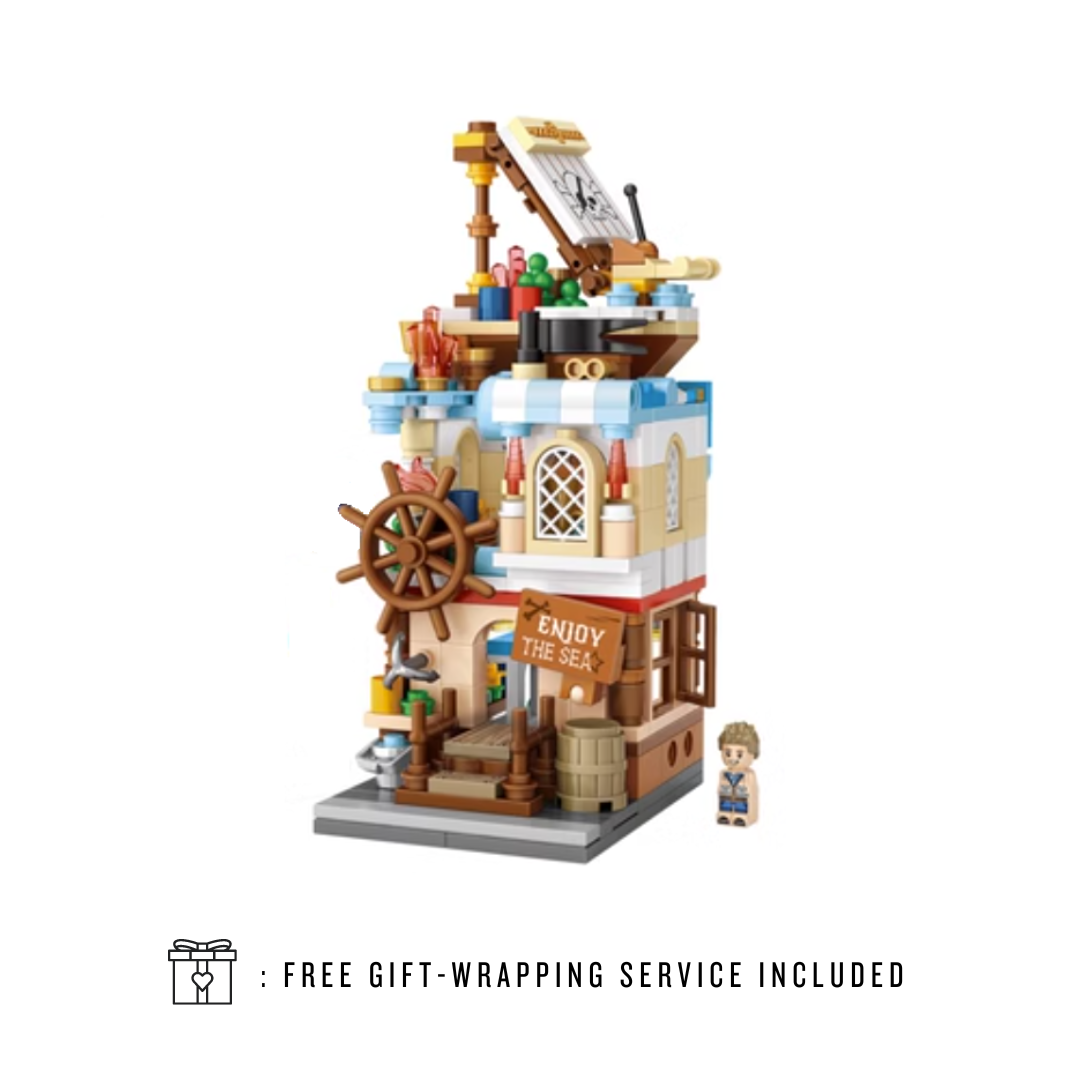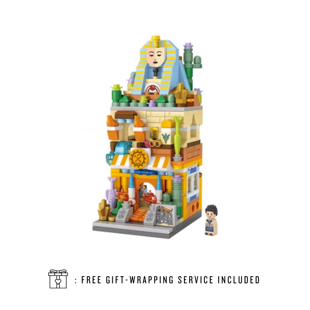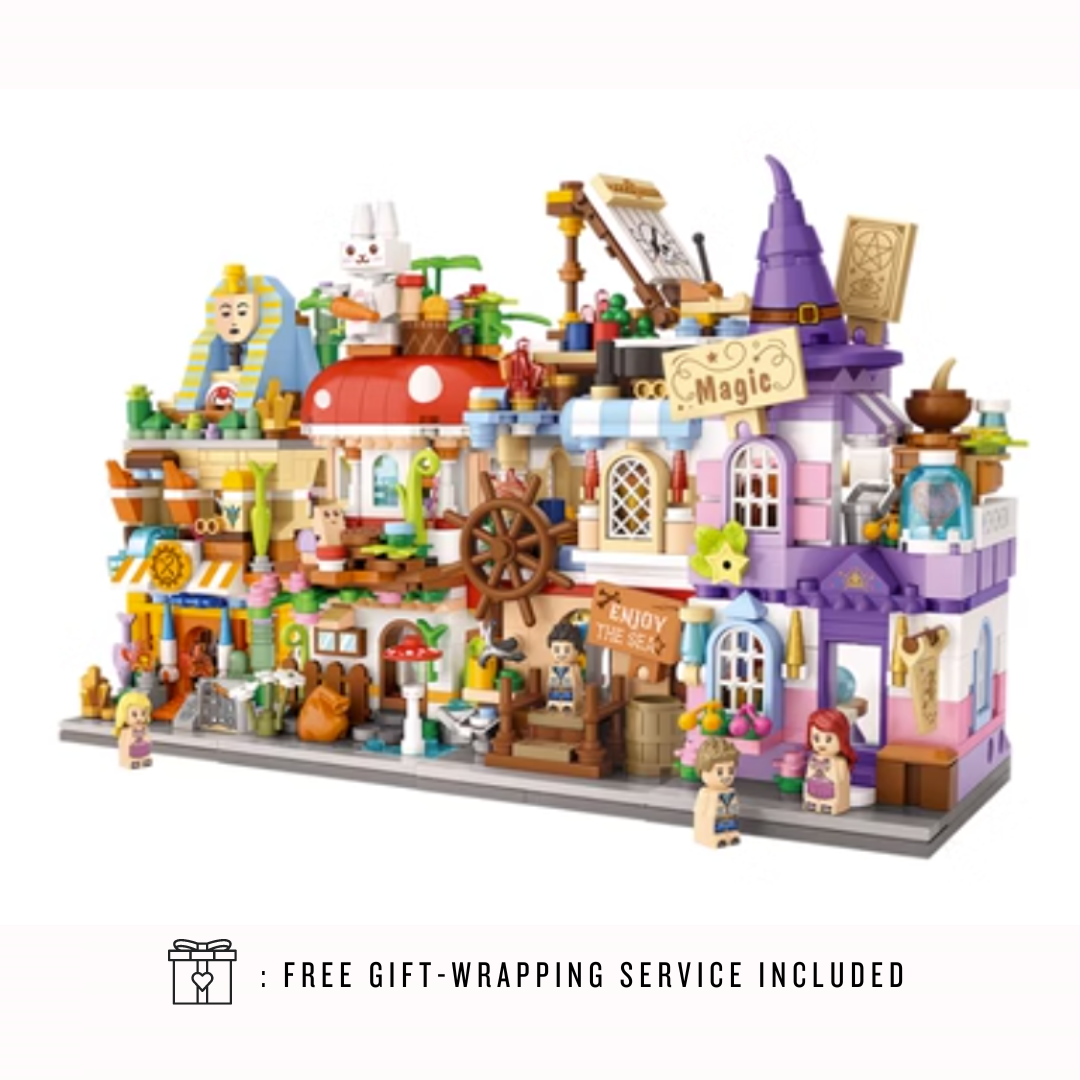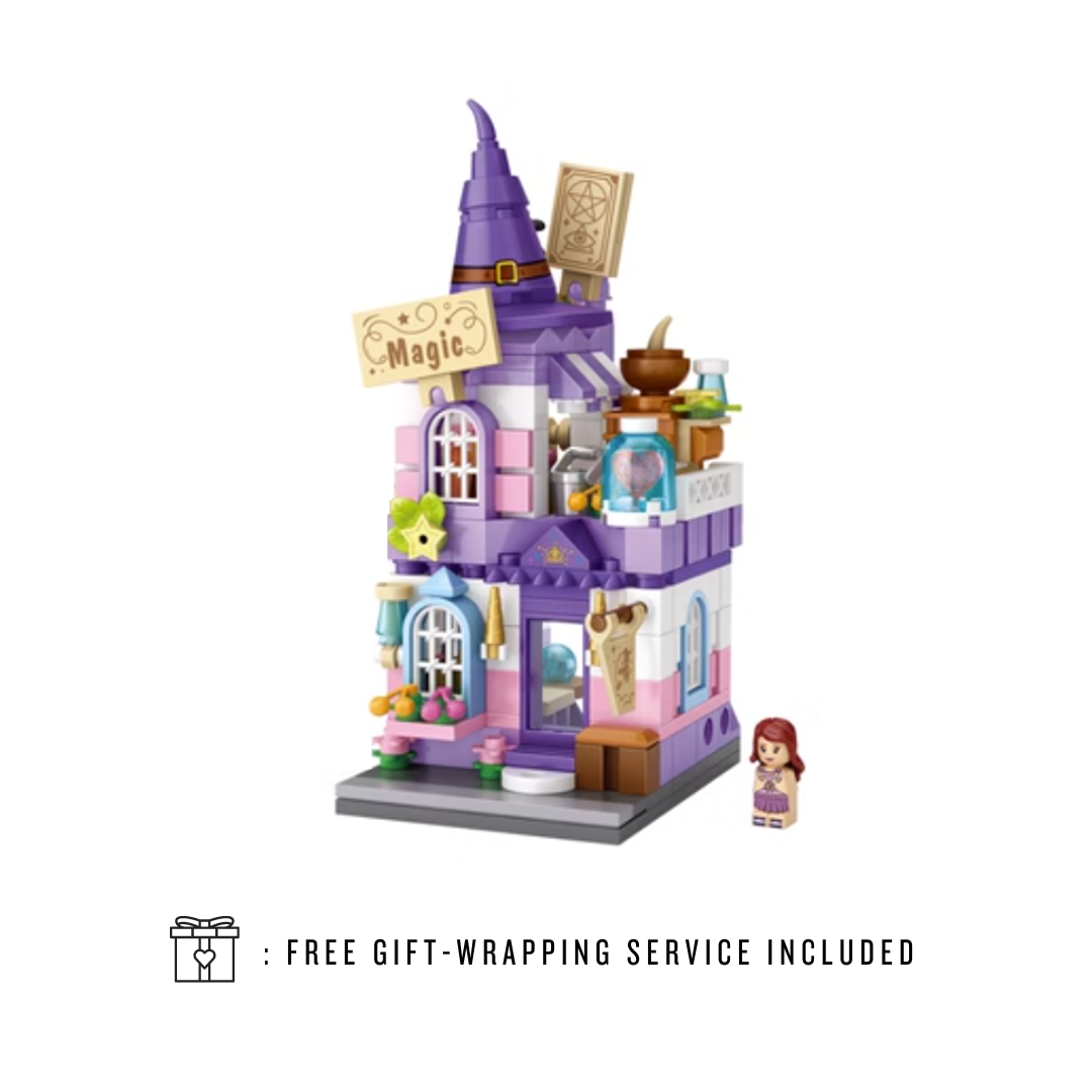 Mini Mythic Alley scene building blocks, featuring mythical stores which can be combined to be displayed as a set or individually.