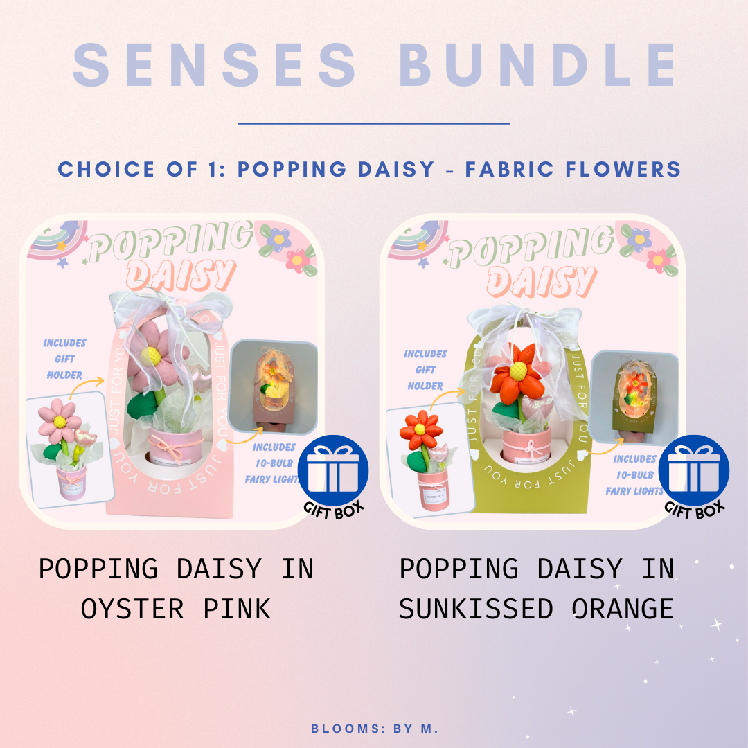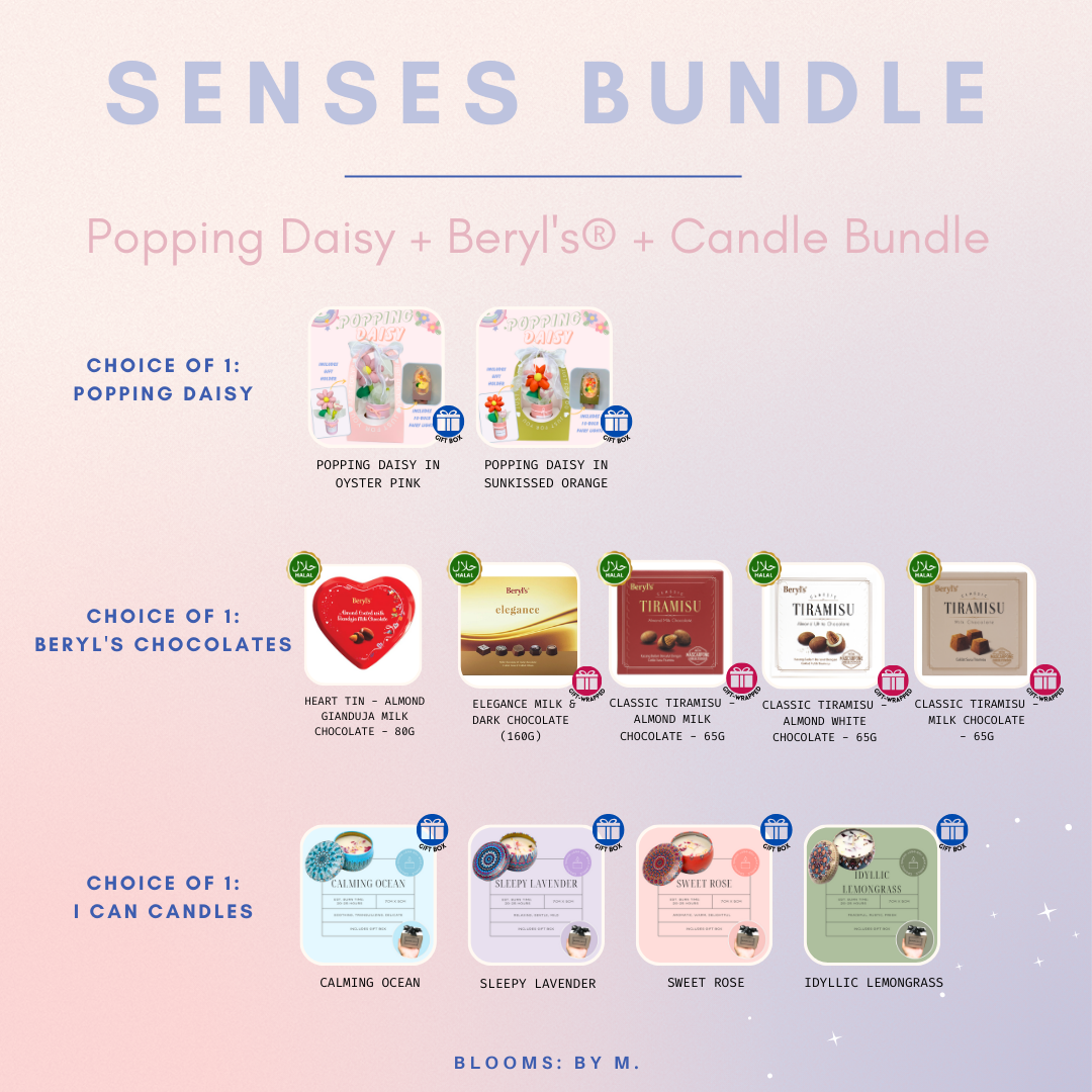 Senses Bundle - Popping Daisy Fabric Flower + Beryl's Chocolate (Halal) + Candle