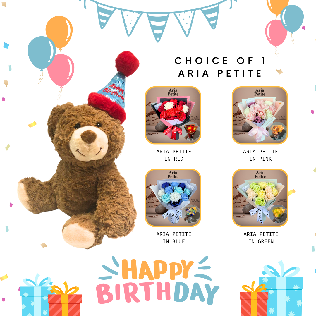 Soft Toy Plushie-Birthday Teddy + Soap Flower Rose Bouquet Aria Petite Bundle